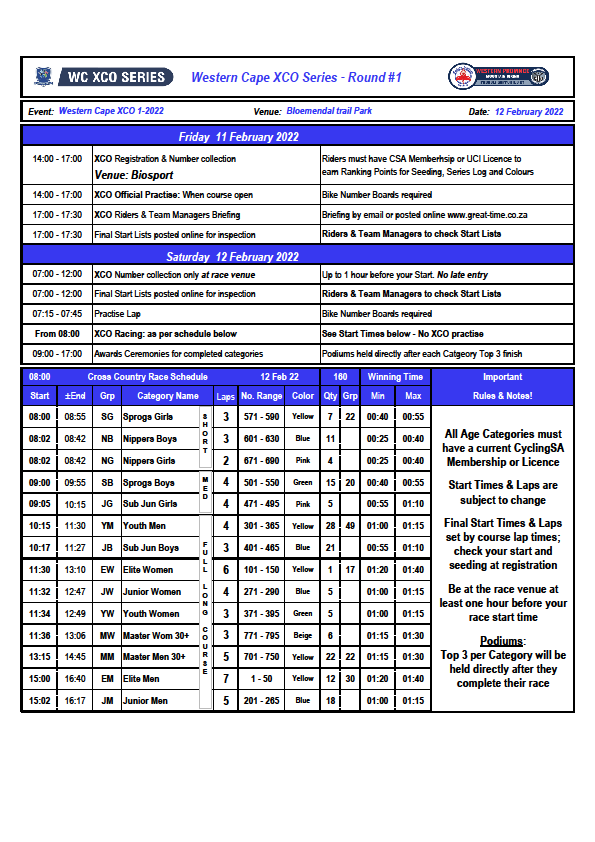Please Note:>>> For riders to earn XCO Series Log points and XCO Ranking Points, it is a requirement to have a current CSA Membership, on the day of the race, as detailed here below. Riders without a current membership on the race date do not earn any points.