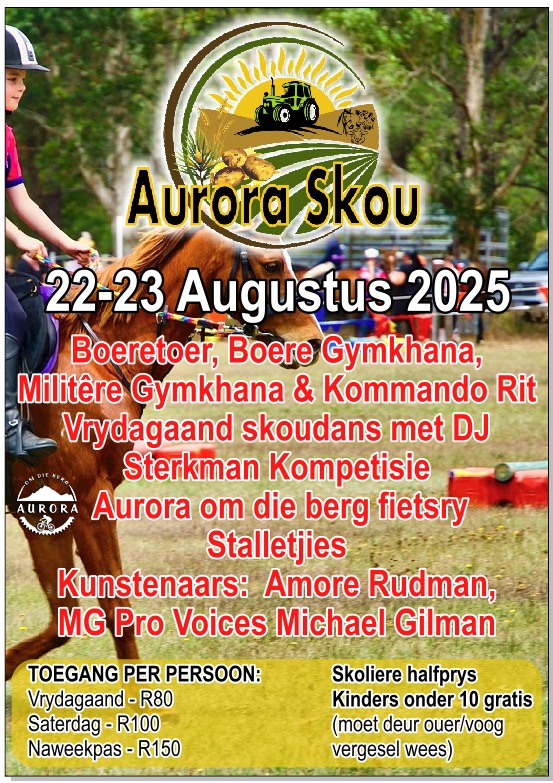 AURORA OM DIE BERG. This is an annual cycling event that is hosted alongside the AURORA SKOU. There are 3 cycling routes, starting with a fun 10km, an intermediate 20km and an exciting and adventurous 55km. The 55km route will take you through farm routes and around the Aurora mountain, back to town. This route is a challenge for many, but if you are able to enjoy the scenery along the way, you will enjoy the flowers in full bloom, on a single track over the mountain. This route is only open for this event, so make sure not to miss out. The start and finish is at Aurora Skou, where food, drinks, Sandveld hospitality and events will keep you and your family entertained.