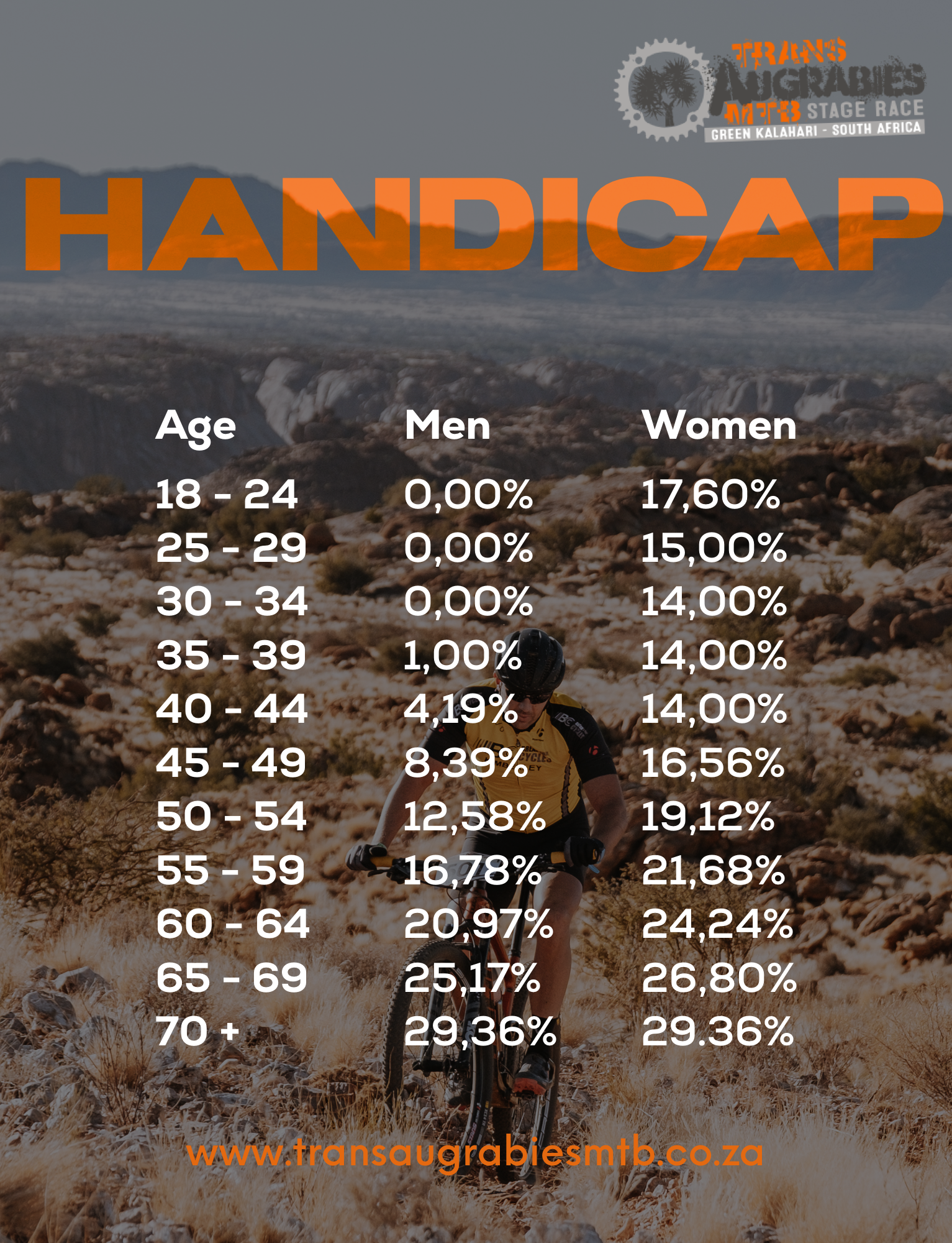 Your actual race time is reduced by a handicap percentage based on your age and gender, resulting in your handicap time. This system levels the playing field while still rewarding great performance.