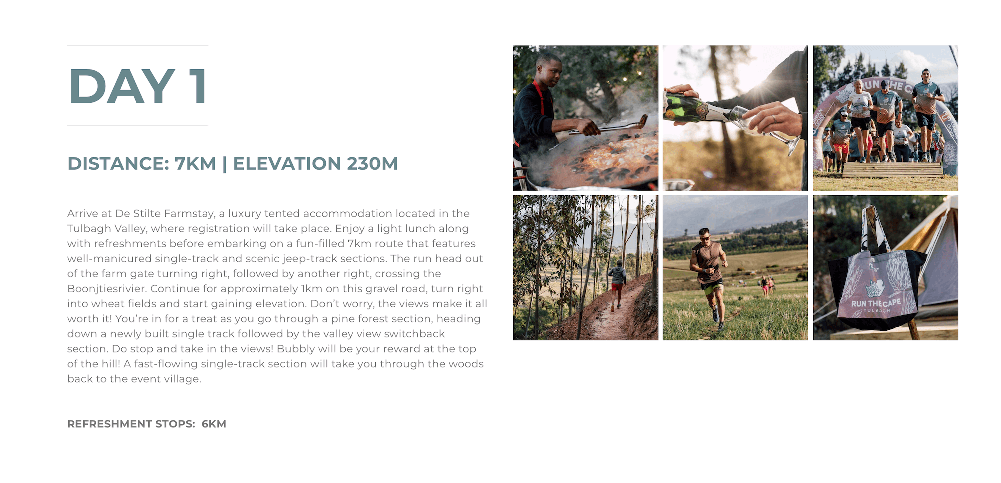 Run the Cape is an all-inclusive luxury trail running and culinary experience through the beautiful Tulbagh Valley. The event is limited to 80 participants, ensuring exclusivity. Runners and walkers are welcome to be part of the experience. Participants will explore the valley’s well-known rolling hills and delight in high quality wine from the area. Participants will enjoy 3-days of exhilarating routes with scenic views of Cape Fynbos, pine forests and wheat fields. Run the Cape offers guests an exclusive and unique off-the-beaten-path experience.