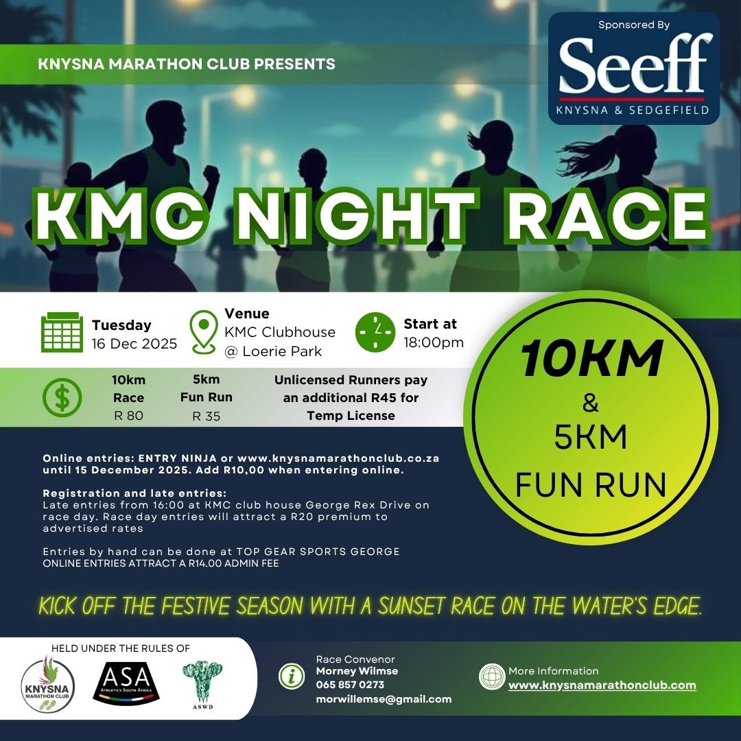 Registration and late entries: from 16h00 at KMC club house George rex drive. Race day entries will attract a R20 premium to advertised rates Online entries-ENTRY NINJA or www.knysnamarathonclub.co.za -14 August till 15 December 2025. Add R10,00 when entering online. Enter at the following sport shop by hand: Top Gear George | ||||||||||||||||