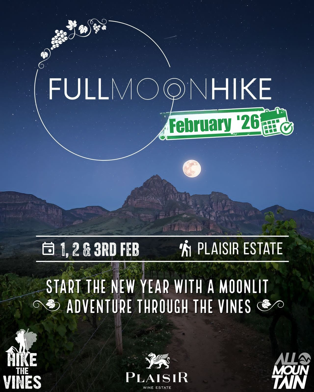 Rooted in History, Refined by Nature – join us for a magical moonlit adventure at Plaisir Wine Estate, as we explore forest trails, catch the sunset, and watch the full moon rise from the slopes of Simonsberg.