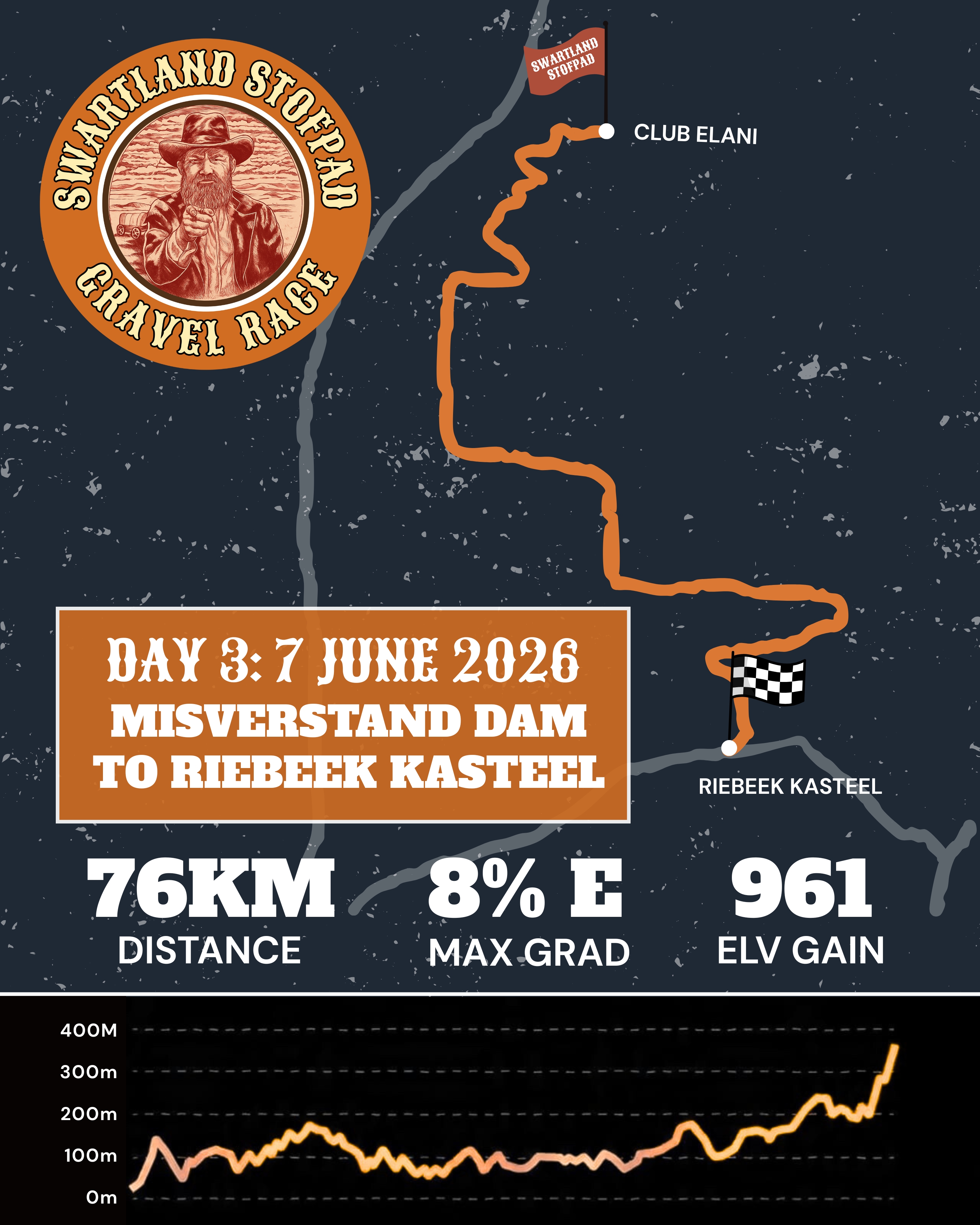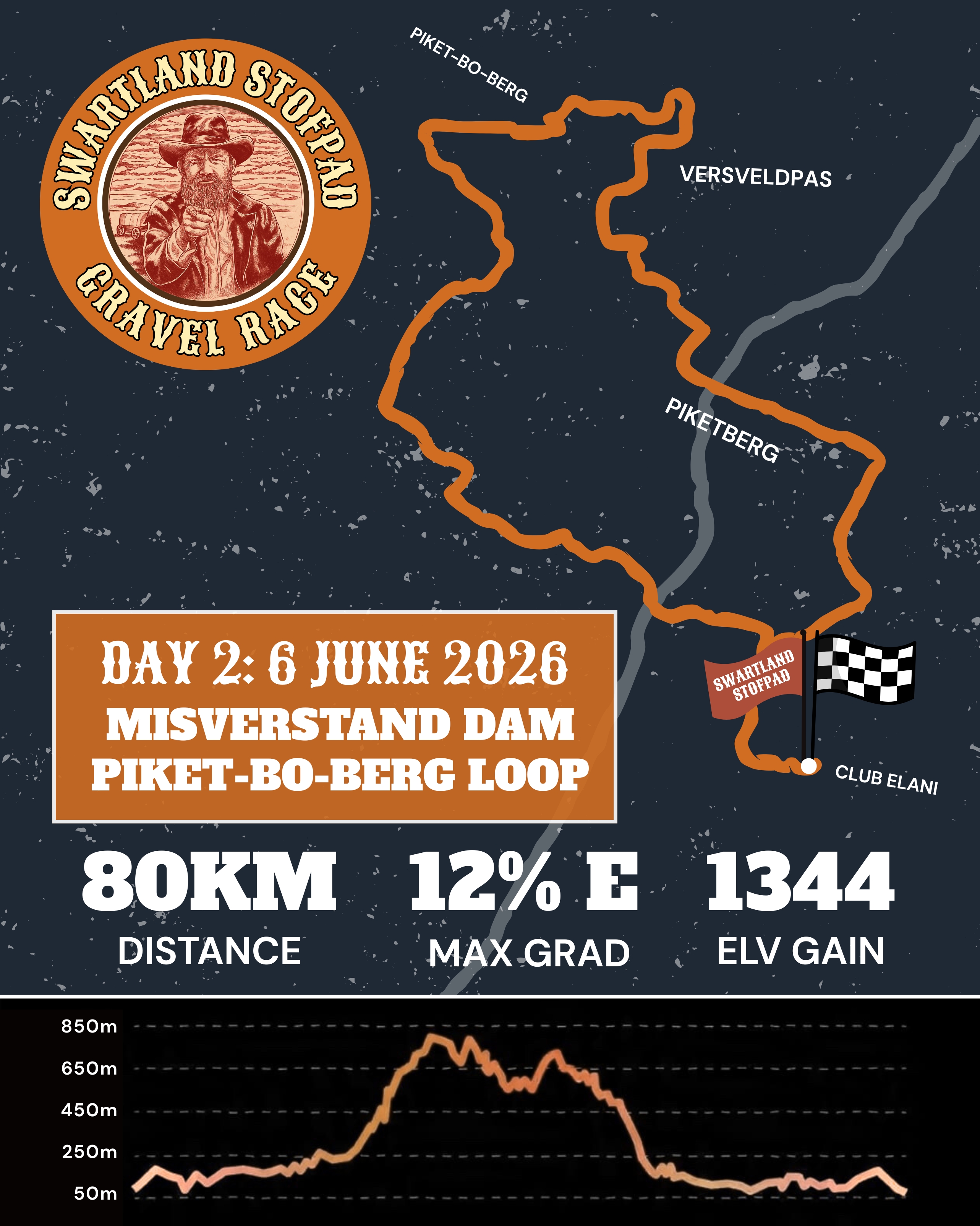 Each day is an average 80kms, with the biggest elevation day coming on Day 2 thanks to the iconic Versfeld Pass!