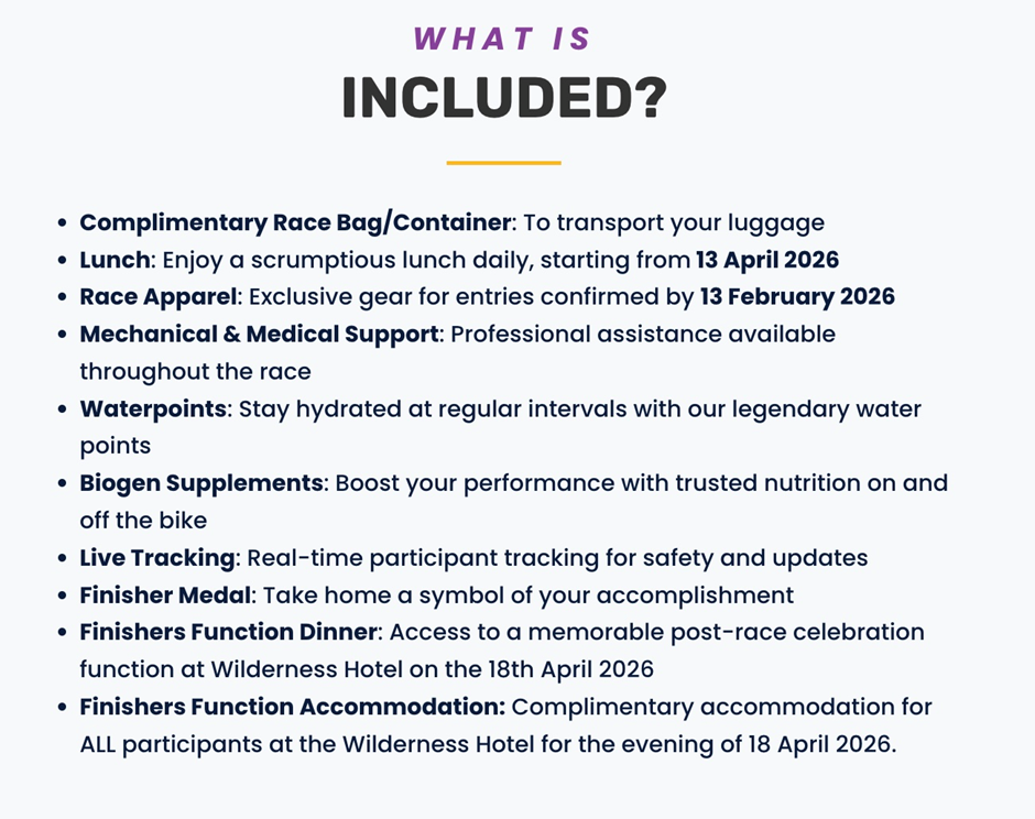 The Garden Route Giro entry fee covers all on-route essentials, daily lunch, access to the final night’s finisher function dinner,