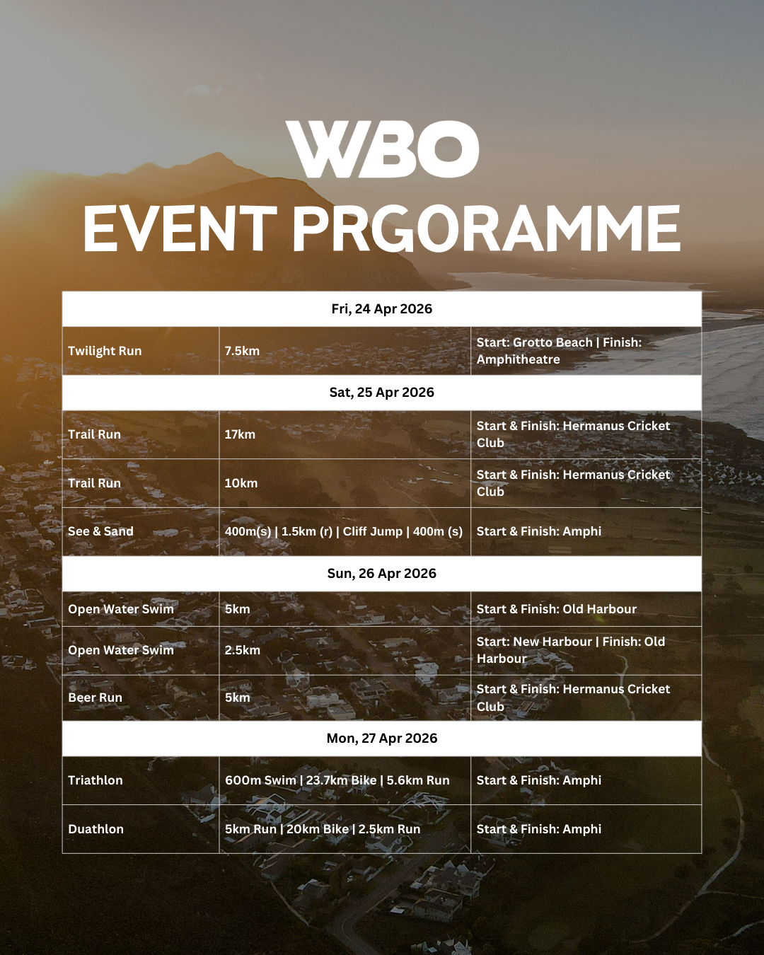 Walker Bay Outdoor (“WBO”) Hermanus is a multi-day multi-discipline outdoor sports and lifestyle festival held in and around Hermanus and the Walker Bay region at the end of April each year.