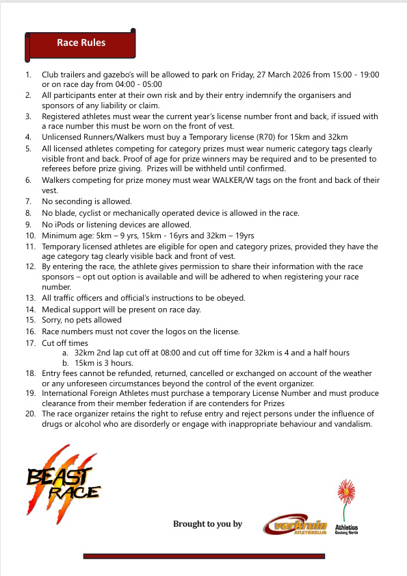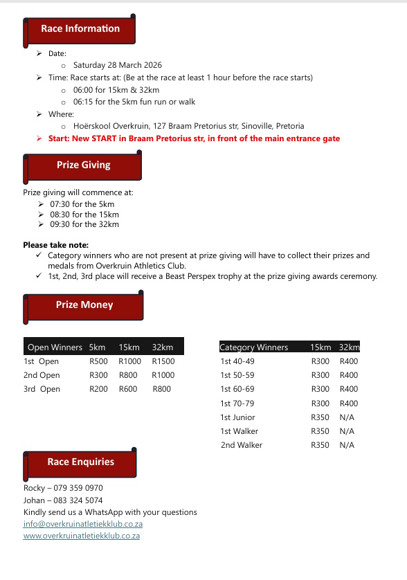 | 15km (R220 + R19.80 Fee) | 15 km | R 239.80 |