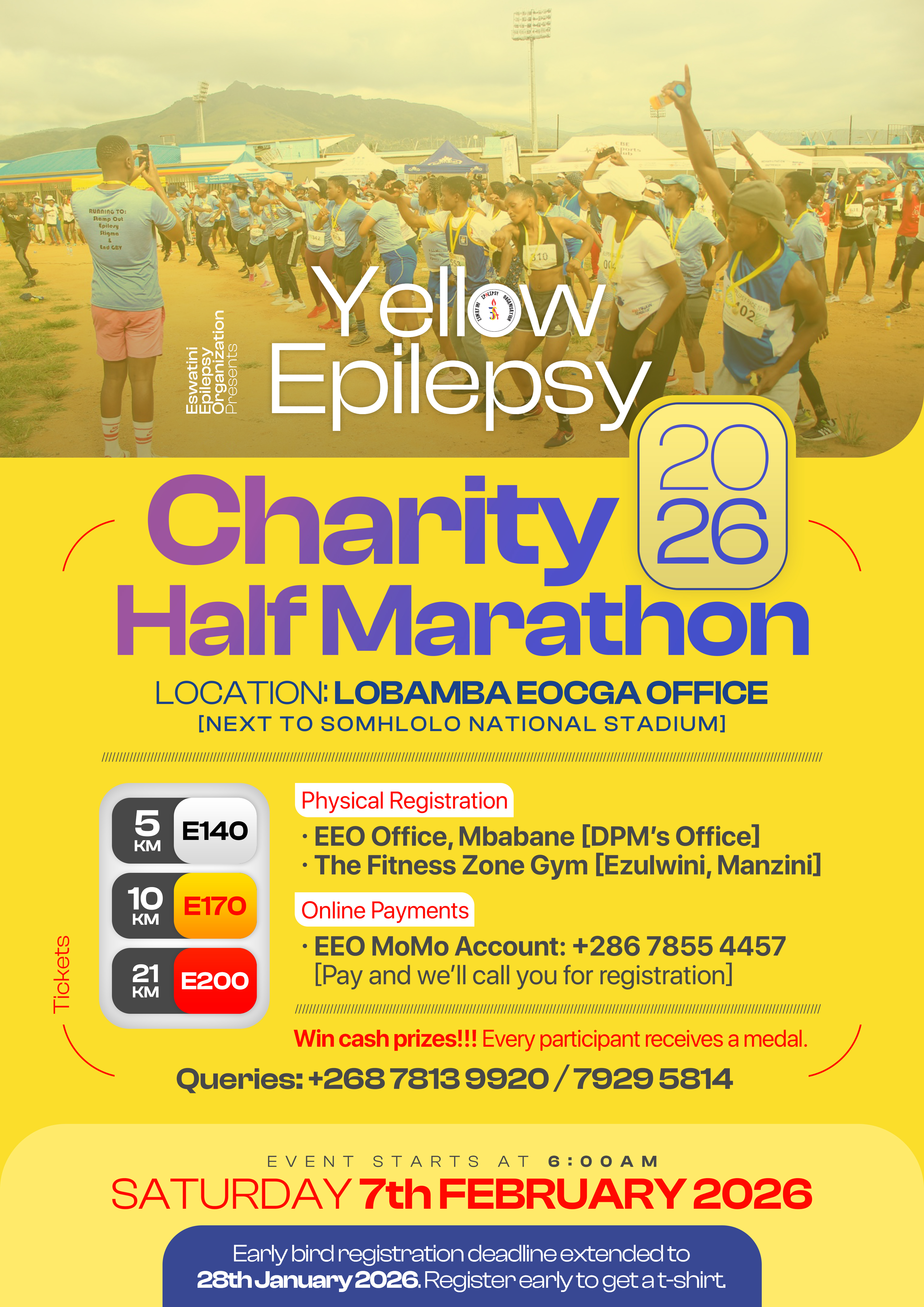 The Yellow Epilepsy Charity Half Marathon is an annual event hosted by the Eswatini Epilepsy Organization (EEO), a non-profit organization based in Eswatini. This upcoming event will be the 10th edition in the series. The event continues to grow each year, seeing the participation of more and more individuals. The Yellow Epilepsy Charity Half Marathon has the aim of raising awareness of the epilepsy condition as a means to curb the stigma and discrimination often experienced by those living with the epilepsy condition. The event is also a means for EEO raise funds to execute its various projects and initiatives which, in addition to awareness & advocacy, fall under the programmatic themes of health support, social welfare & community development, and research.