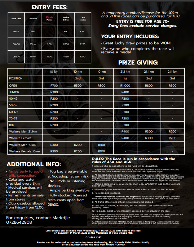 | 10 km (R200 + R18.00 Fee) | 10 km | R 218.00 |