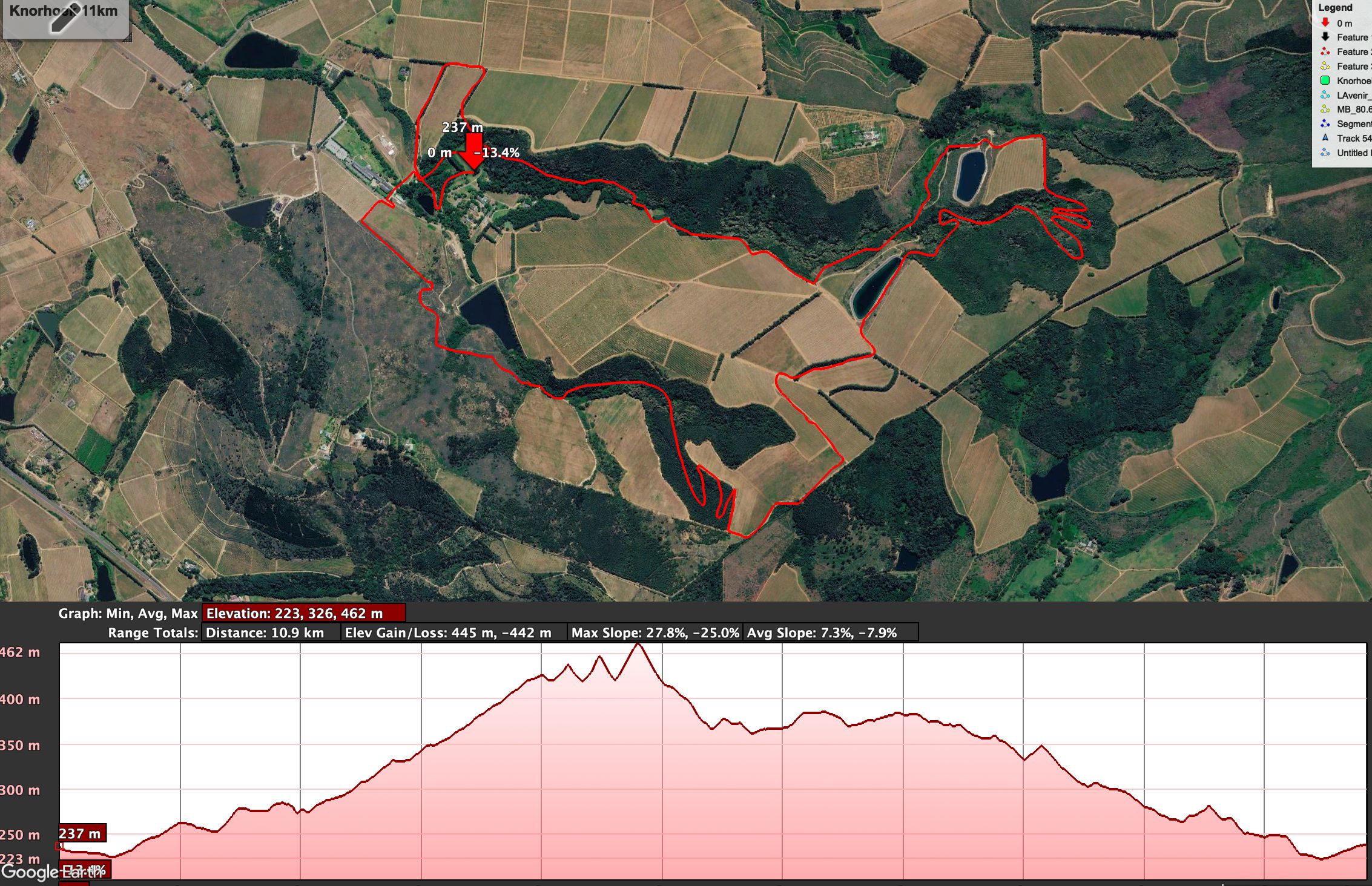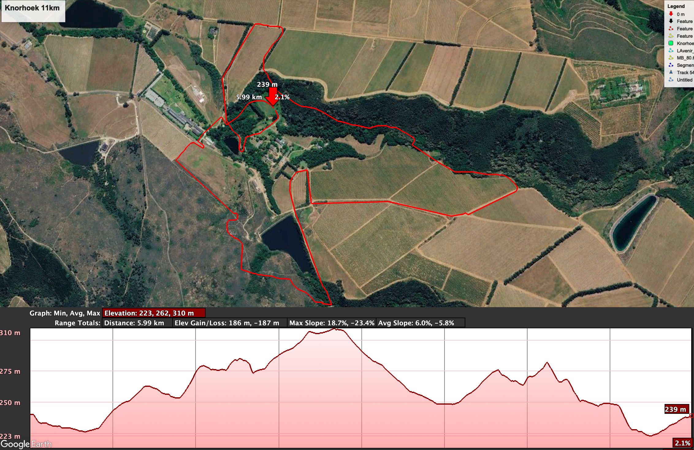 | Route information | ROUTE DESCRIPTIONS: These routes have Dirtopia signature trails through forest and various other terrain in the Knorhoek valley below Simonsberg mountain. Not to be missed with spectacular views and trail experiences that you won’t soon forget! Meurant Botha designs and marks trails since 1997 – also named the godfather of trails, and still manages the routes himself. |
