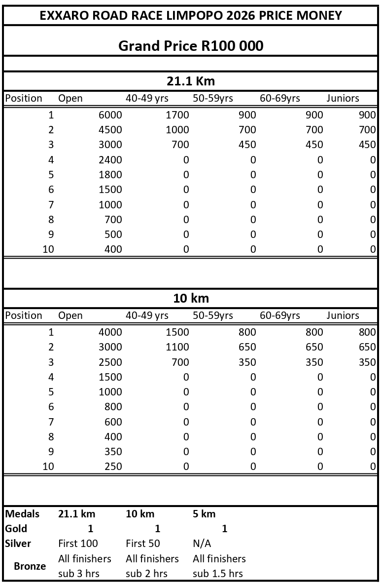 - The event is conducted in accordance with the rules of the ASA (Athletics South Africa) and BA.