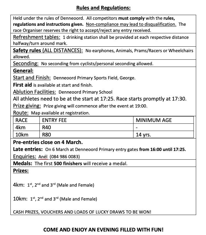 6 March 2026, 17h30 at Denneoord Primary Sportsfield, George, Western Cape