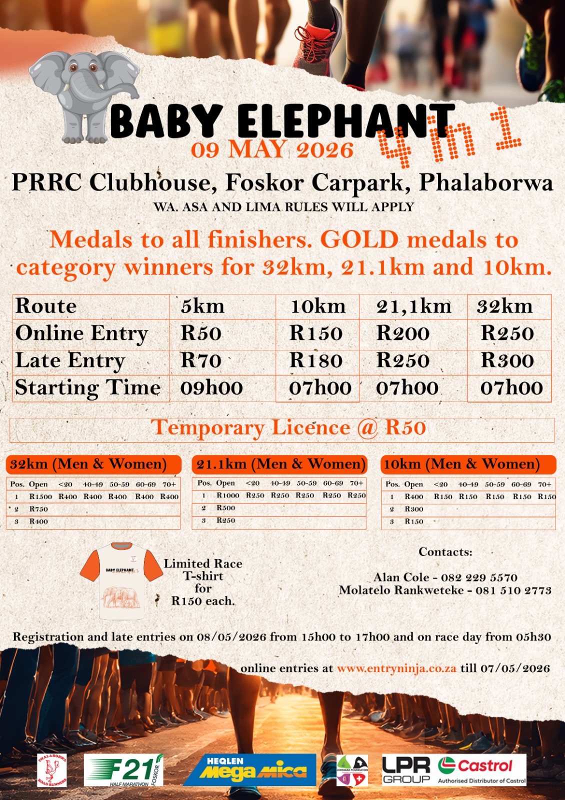 Gold Medals to category winners of 32km, 21.1km and 10km. Limited race T-shirt is R150.