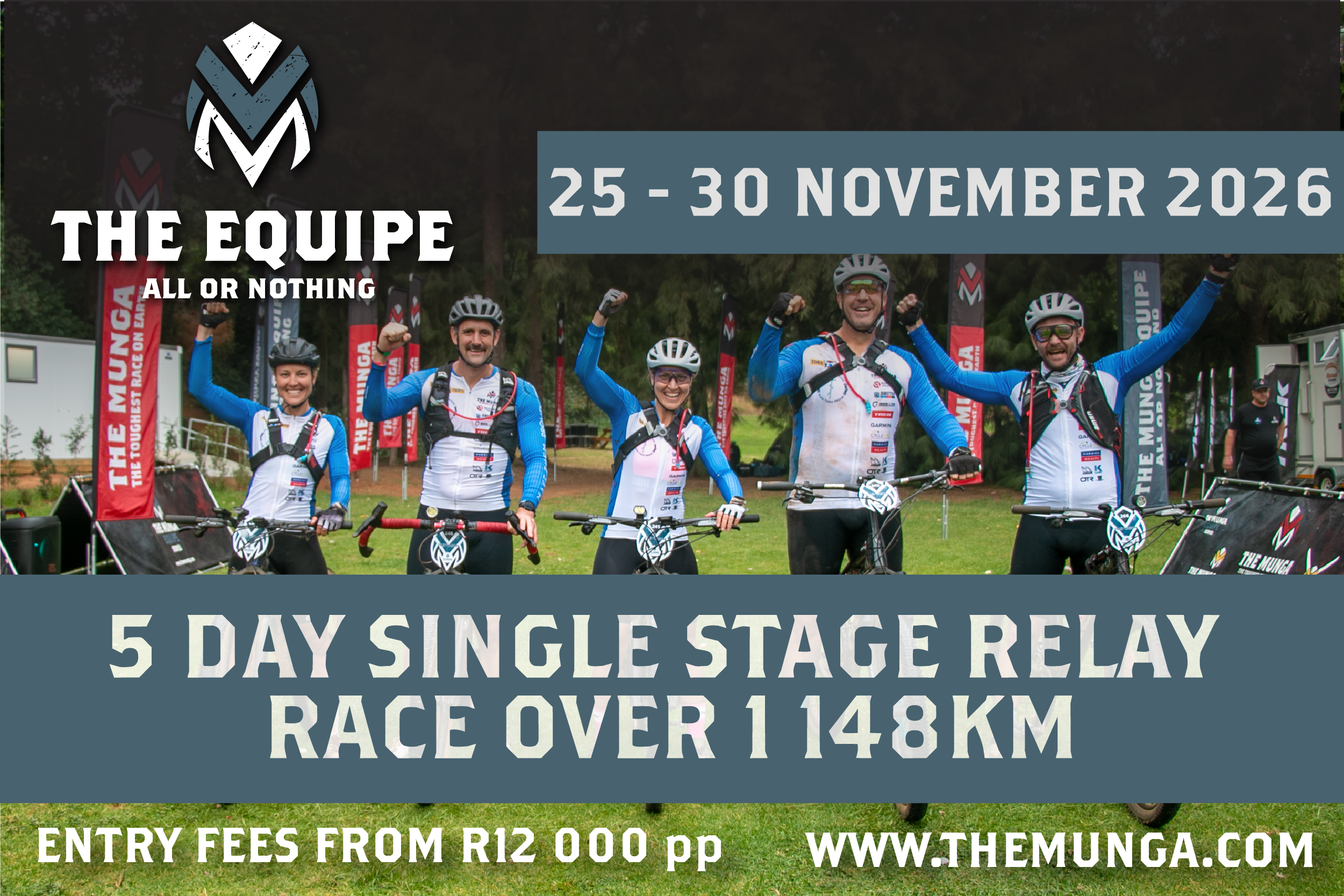The Munga Equipe is a relay format of South Africa's most iconic ultra-endurance MTB race — 1,130km from Bloemfontein to Doolhof Wine Estate in Wellington, divided between a team of two to five riders. Each rider takes on one section of the full Munga route between race villages, racing their leg as hard and fast as they can before handing the baton to the next.