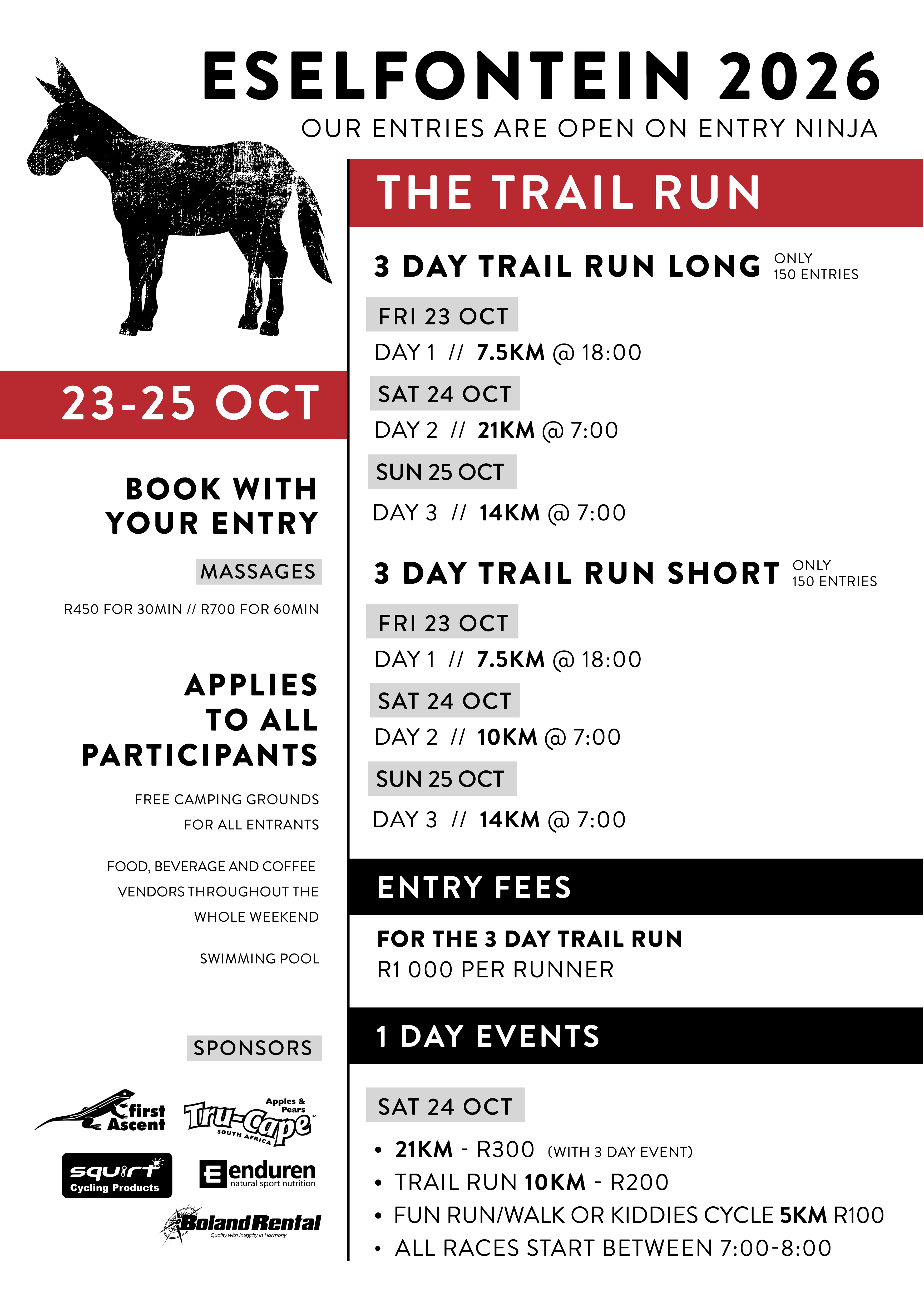 | 5km Trail Run 24 October 2026 | 5 km | R 100.00 |