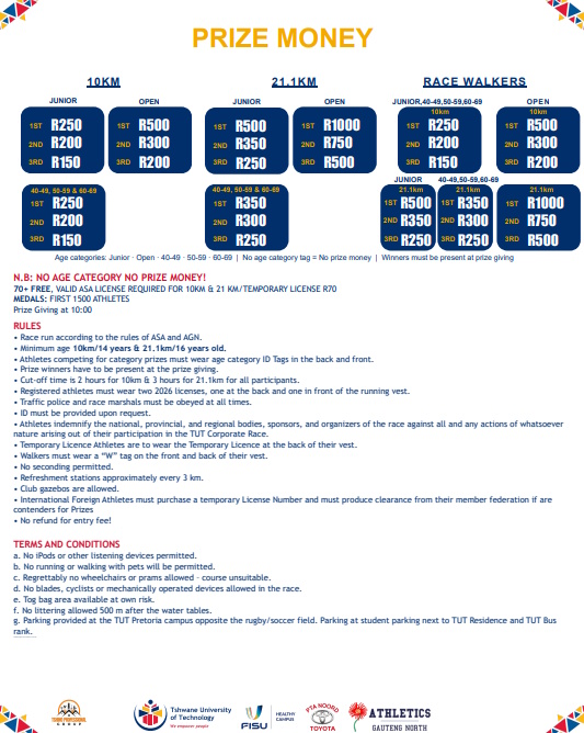 | 21km (R200 + R18 Fee) | 21 km | R 218.00 |